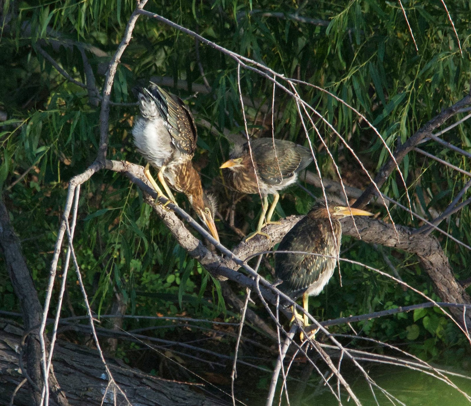 The young herons are growing, but a few of them still have their downy feathers atop their heads.